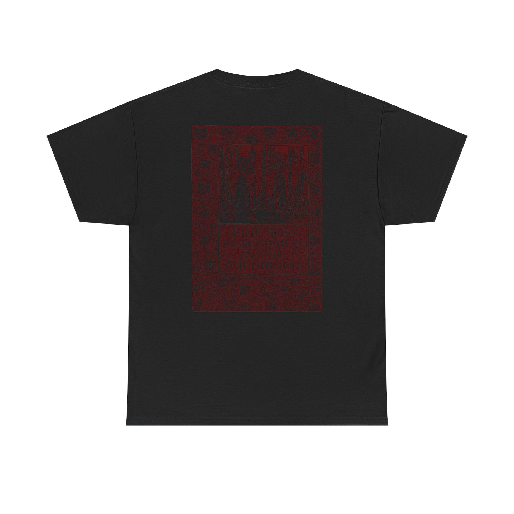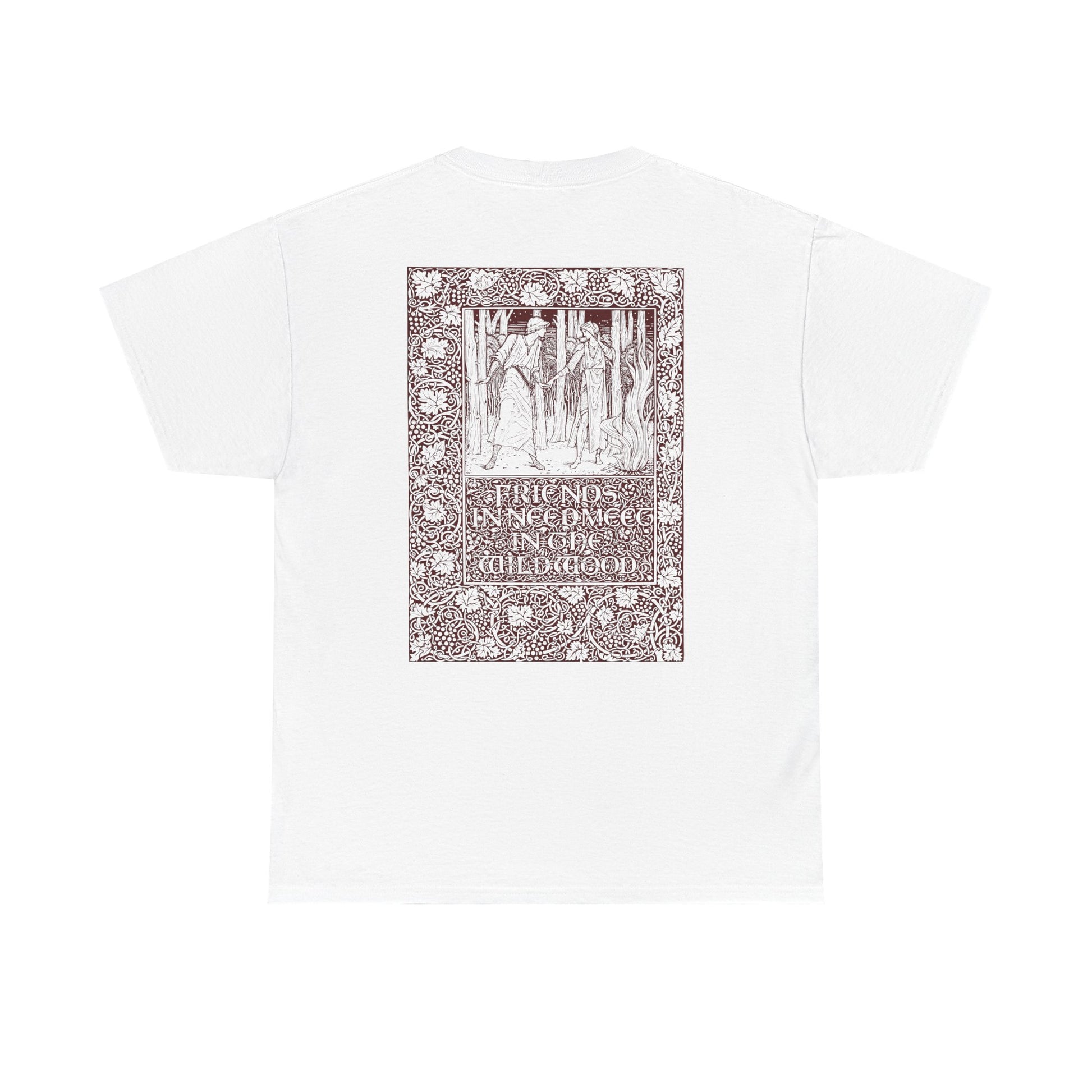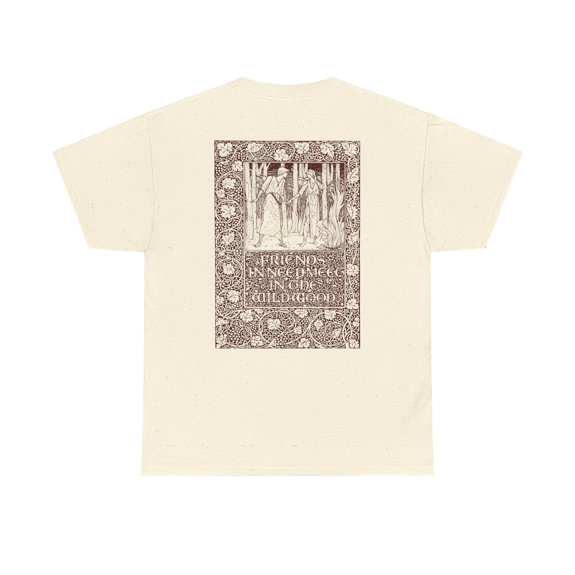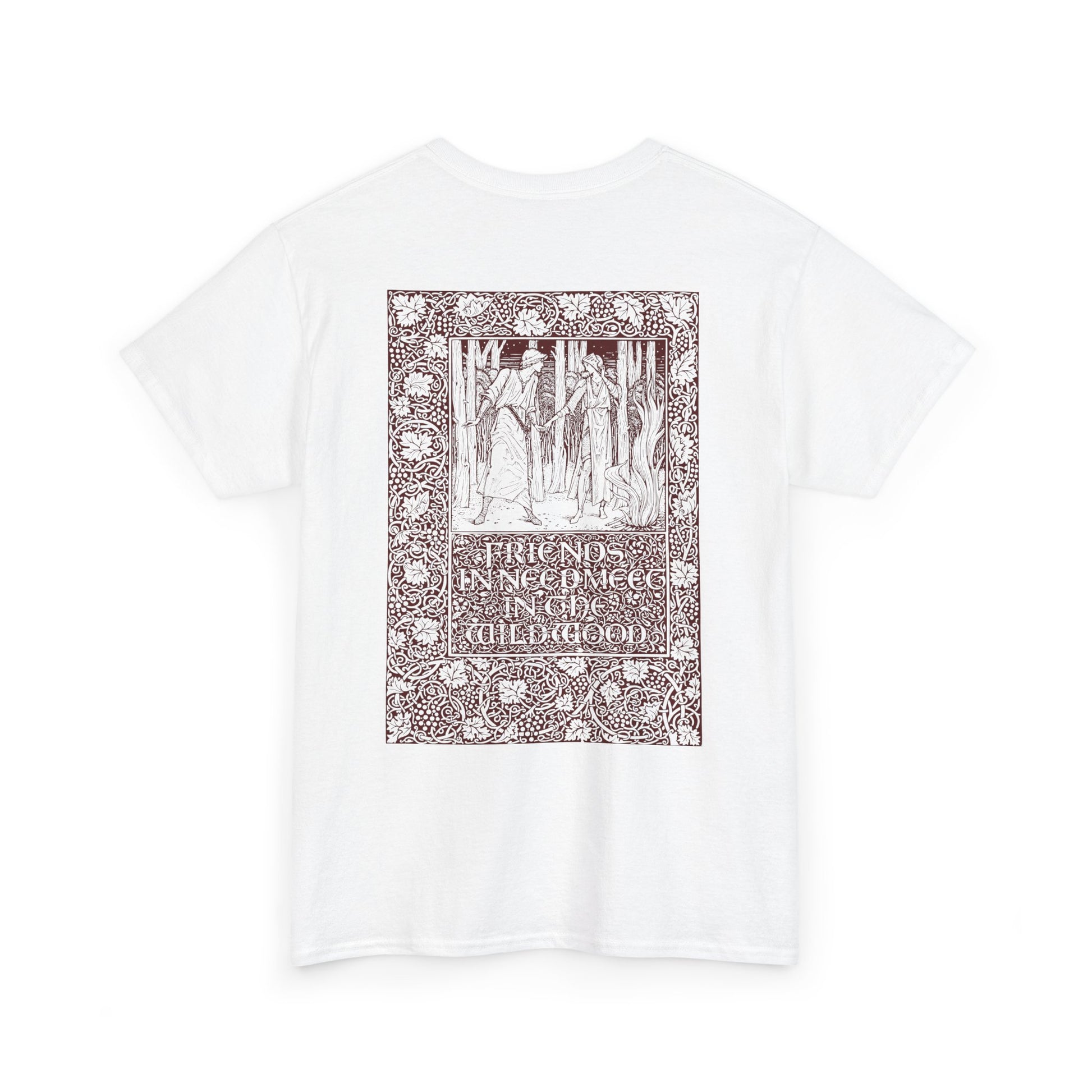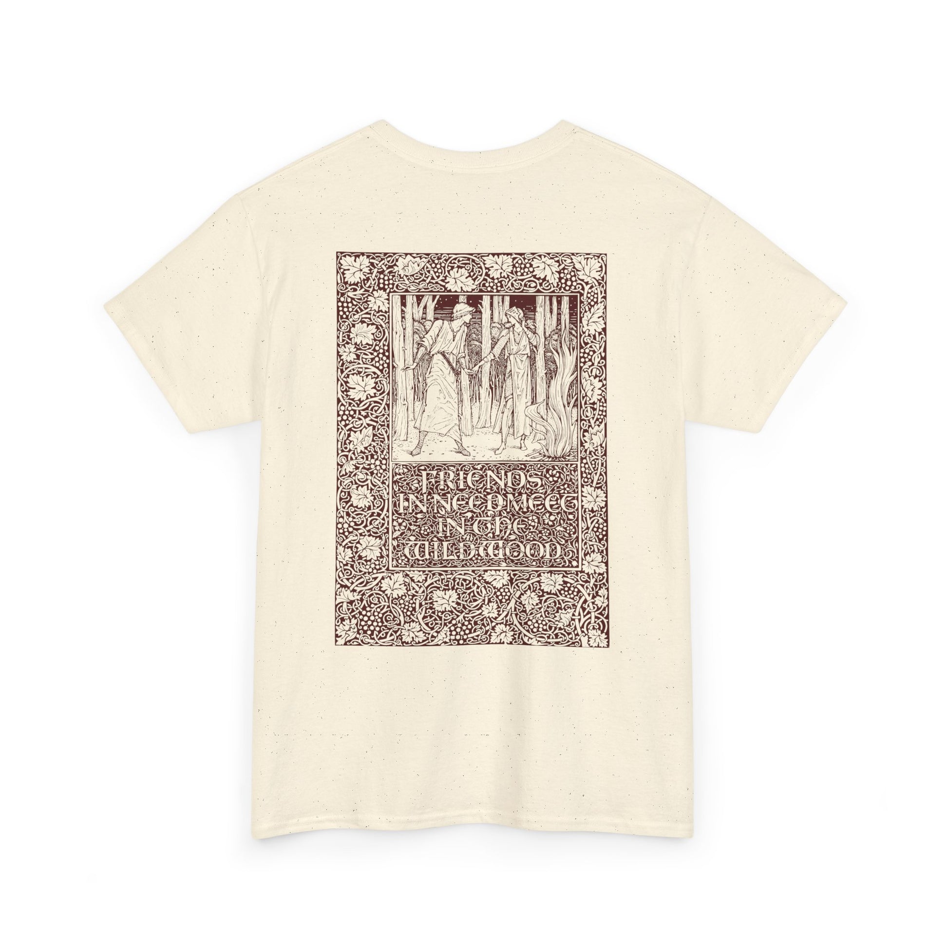 This shirt features an authentic print from The Well at the World’s End (1896), a classic romance by William Morris — poet, artist, and father of the Arts & Crafts movement. Inspired by medieval woodcut traditions, the design reflects Morris’s love of faith, folklore, and craftsmanship.